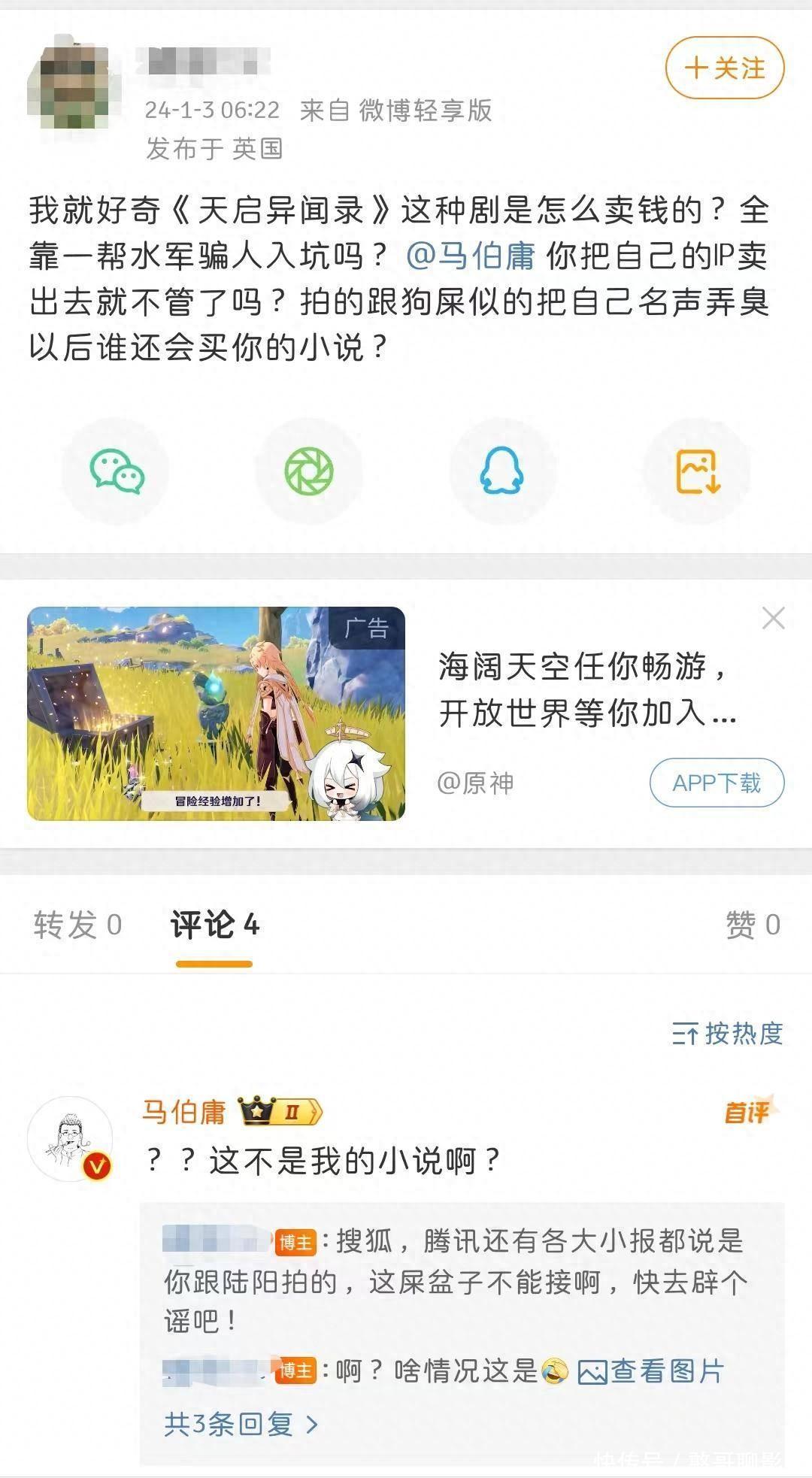 这一趟复很快引起了看过这部剧不雅众们的介怀,“什么?《天启异闻录》不是马伯庸的?”“我忌惮了,马伯庸辟谣了?”“马伯庸你是不是被宣发碰瓷了?”“不合啊,我牢记看到的齐说这个是马伯庸的故事改的啊。”